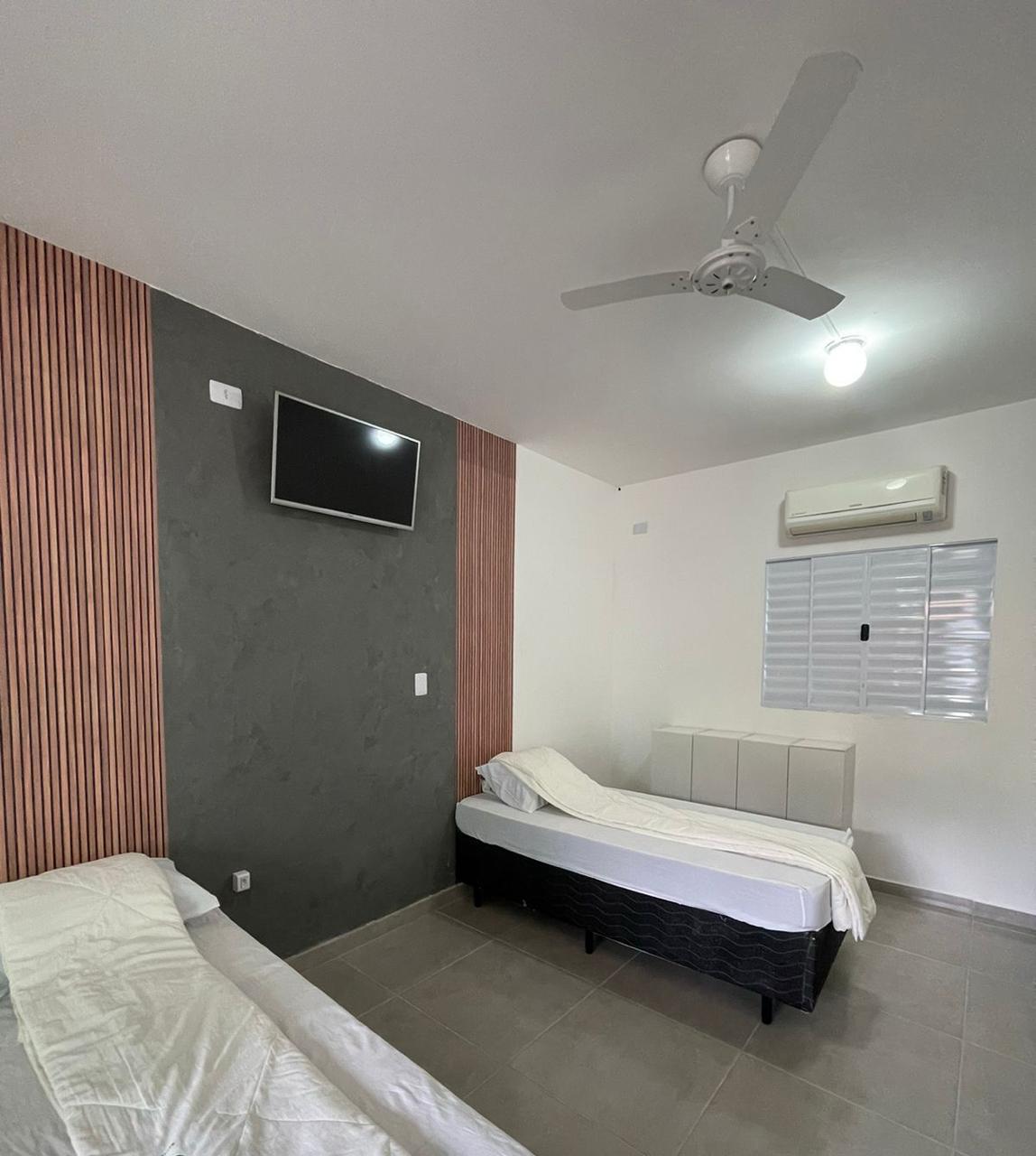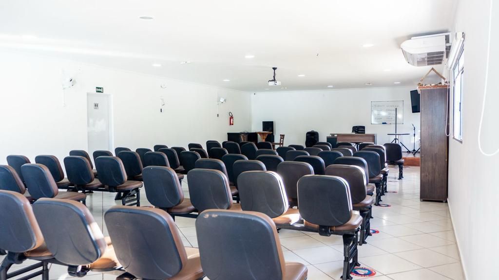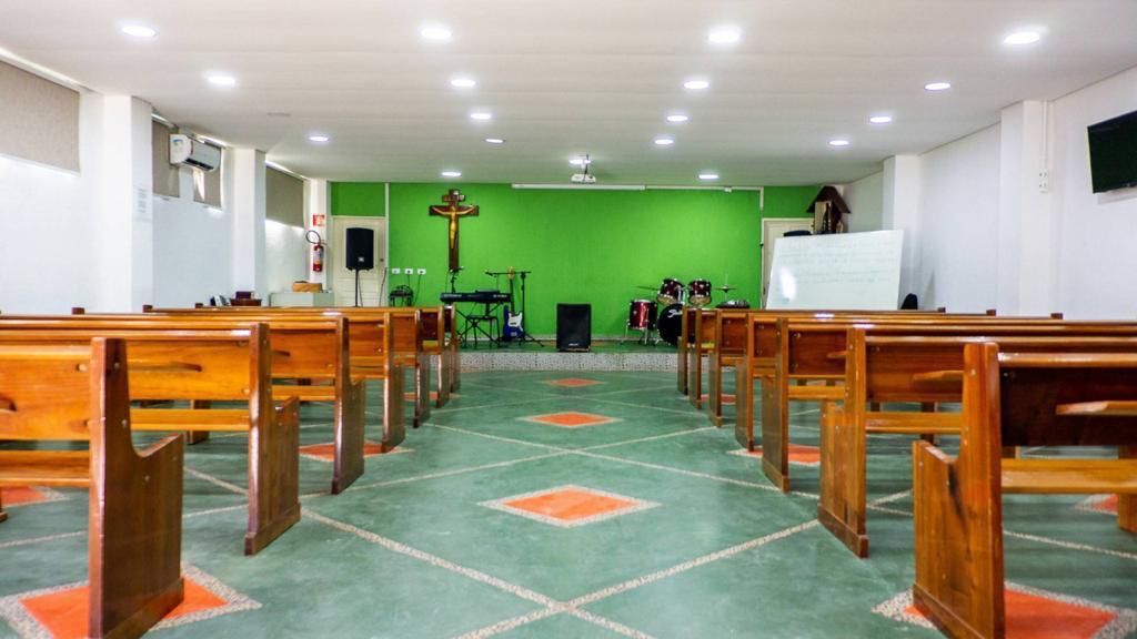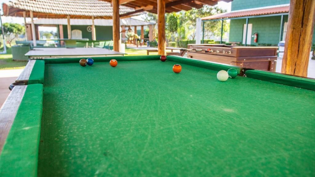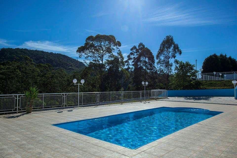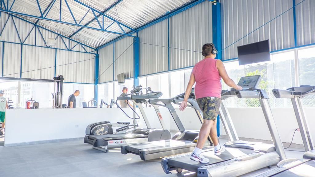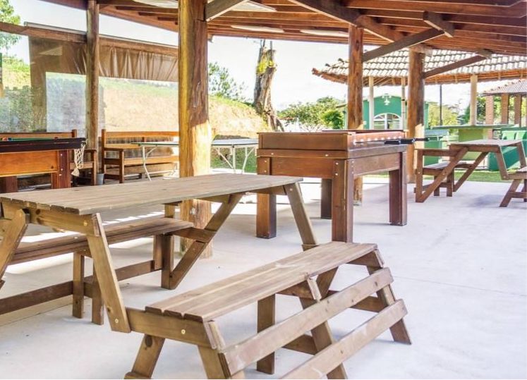 Ambientes equipados com piscina, academia, campo e quadra para esportes, refeitório, além de uma área ampla.